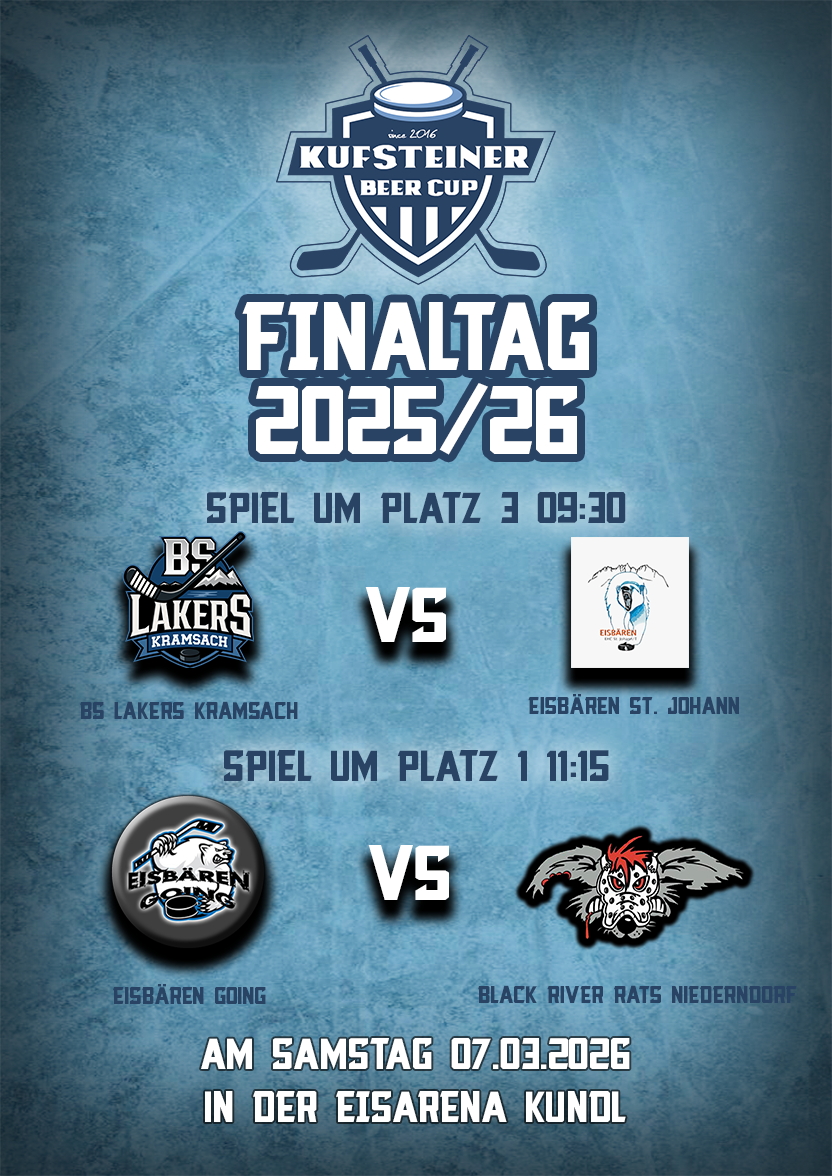 Im Anschluss folgt gegen ca. 11:15 Uhr das große Finale um Platz 1: Die Eisbären Going treffen auf die EC Black River Rats Niederndorf. Zwei formstarke Teams, ein Ziel – der KBC-Titel 2025/26 und natürlich Ruhm, Ehre und die legendären Bierkisten.